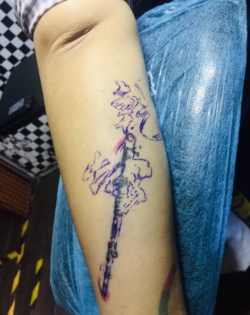 当前位置: 首页 >广东省佛山市纹身店-西樵鲤狮虎刺青纹身图案>书法乾坤遮盖纹身图片_手臂纹身图案