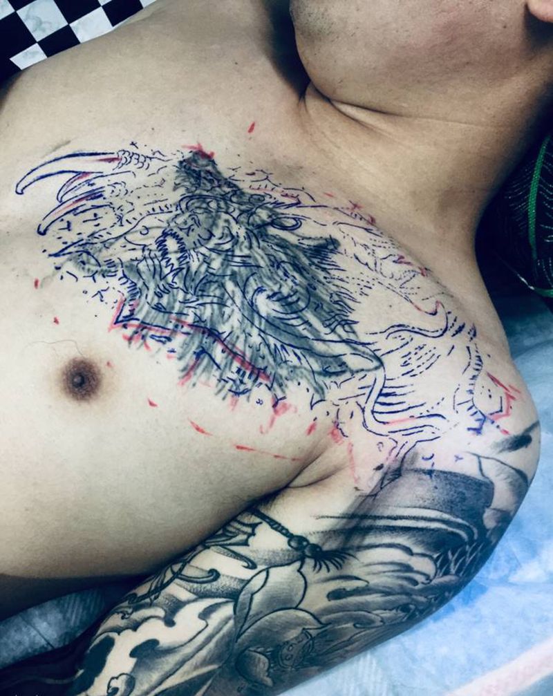 当前位置: 首页 >广东省佛山市纹身店-西樵鲤狮虎刺青纹身图案>胸口遮盖纹身图片_胸部纹身图案