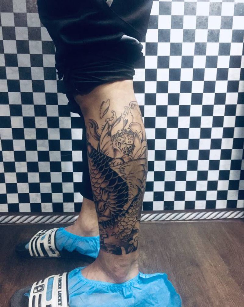 当前位置: 首页 >广东省佛山市纹身店-西樵鲤狮虎刺青纹身图案>半成品彩色未完纹身图片_腿部纹身图案