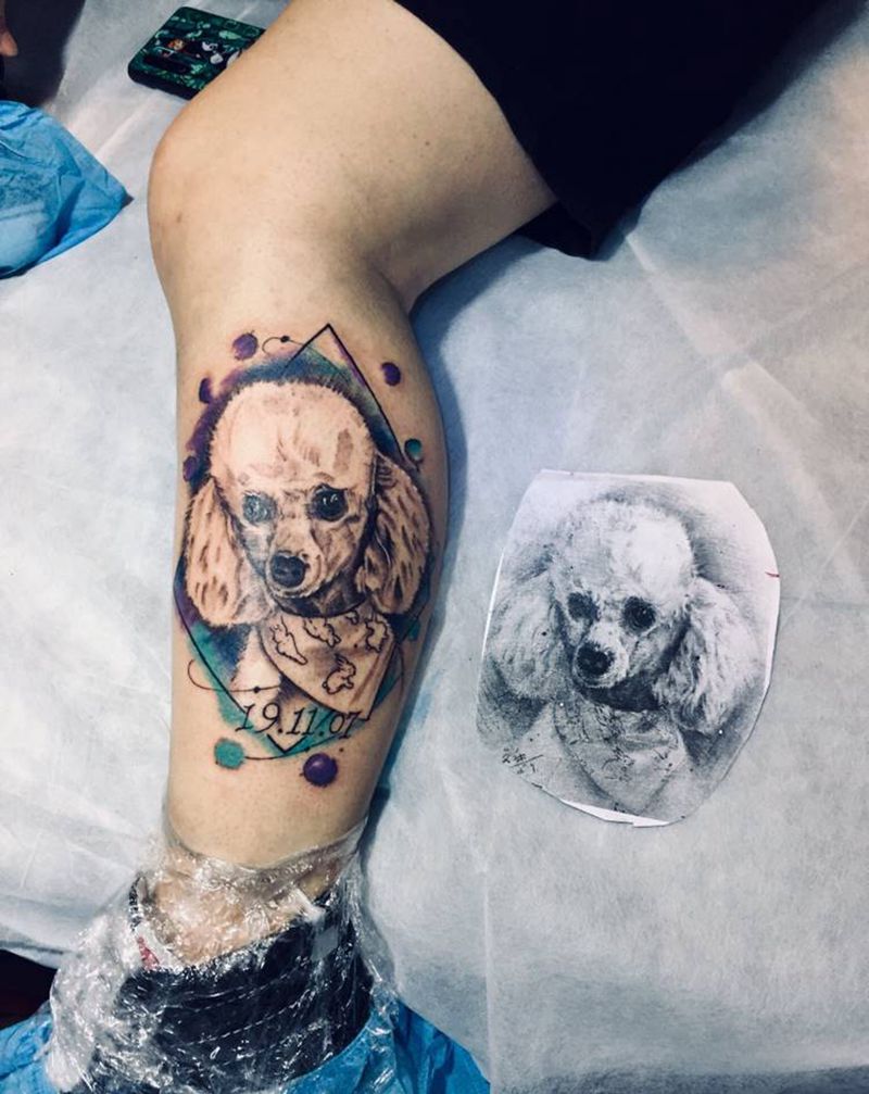当前位置: 首页 >广东省佛山市纹身店-西樵鲤狮虎刺青纹身图案>贵宾犬纹身图片_腿部纹身图案