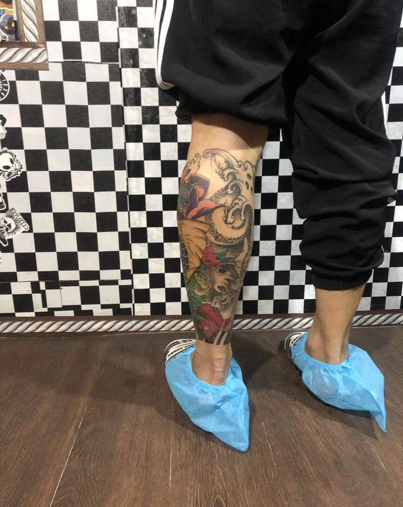当前位置: 首页 >广东省佛山市纹身店-西樵鲤狮虎刺青纹身图案>打雾上色进行中纹身图片_腿部纹身图案