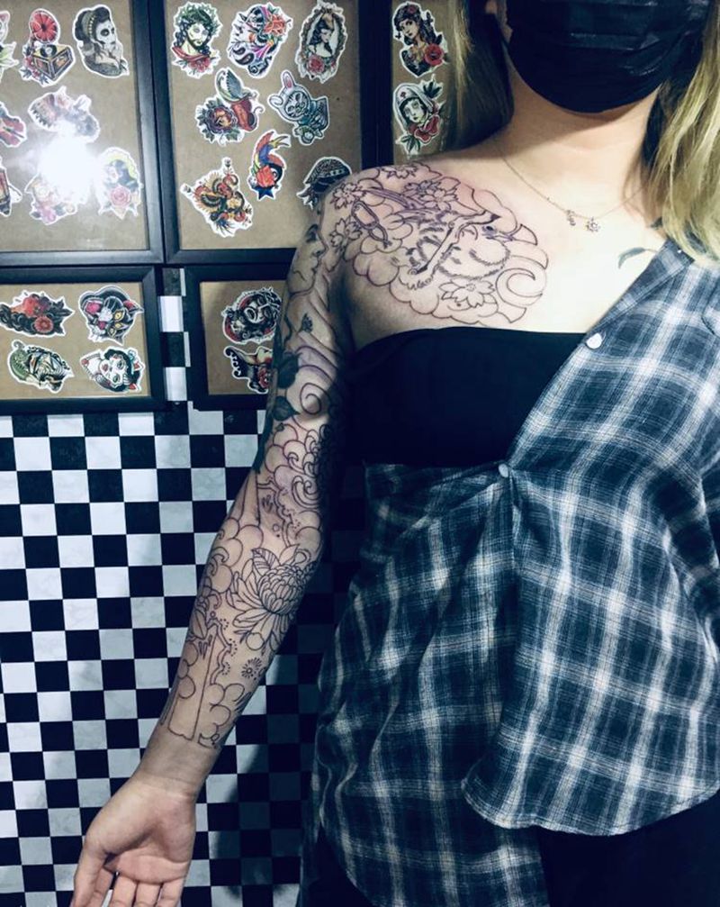 当前位置: 首页 >广东省佛山市纹身店-西樵鲤狮虎刺青纹身图案>花臂线条完成纹身图片_手臂纹身图案
