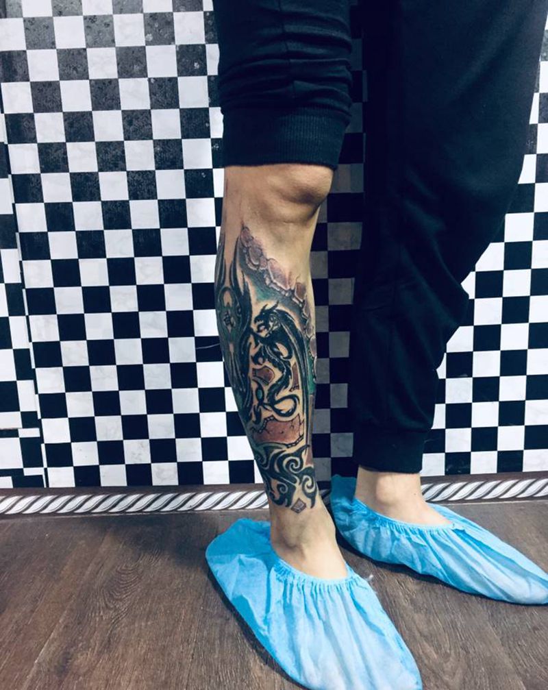 • T网红王老大花腿龙纹身图片_腿部新传统纹身图案