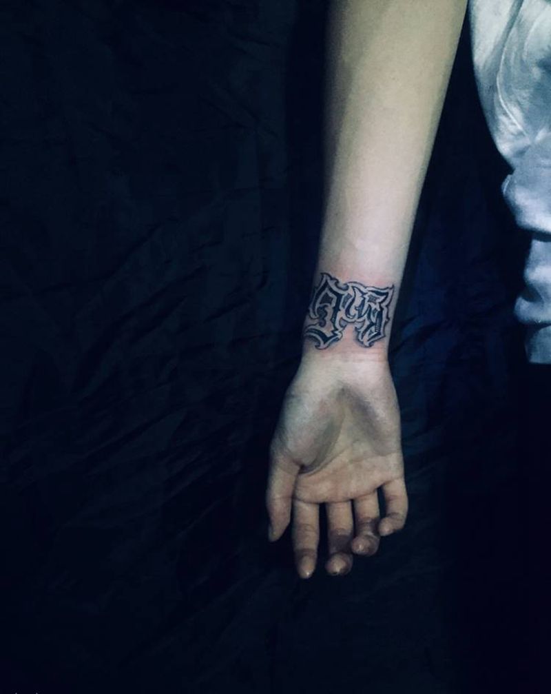 当前位置: 首页 >广东省佛山市纹身店-西樵鲤狮虎刺青纹身图案>奇卡诺手绘KC纹身图片_手臂纹身图案