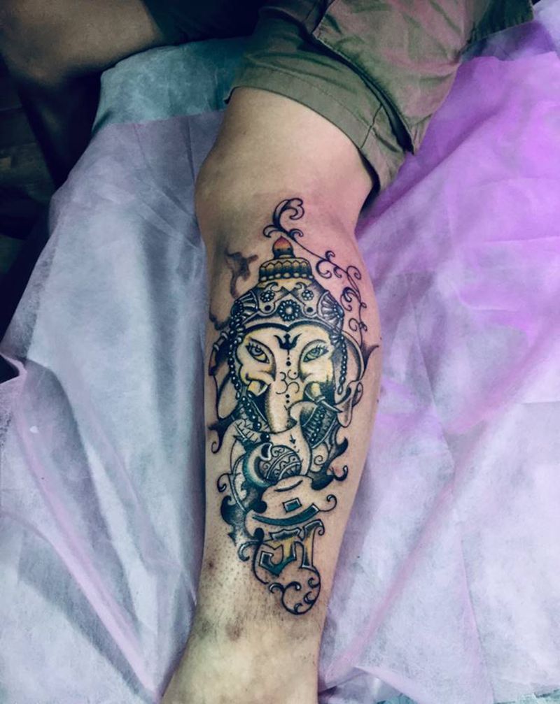 当前位置: 首页 >广东省佛山市纹身店-西樵鲤狮虎刺青纹身图案>象神纹身图片_腿部纹身图案