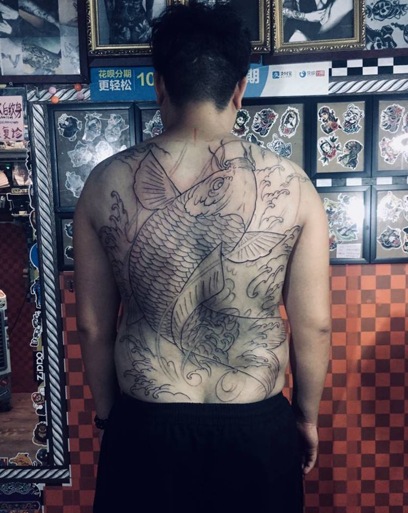 当前位置: 首页 >广东省佛山市纹身店-西樵鲤狮虎刺青纹身图案>鲤鱼线条纹身图片_背部纹身图案