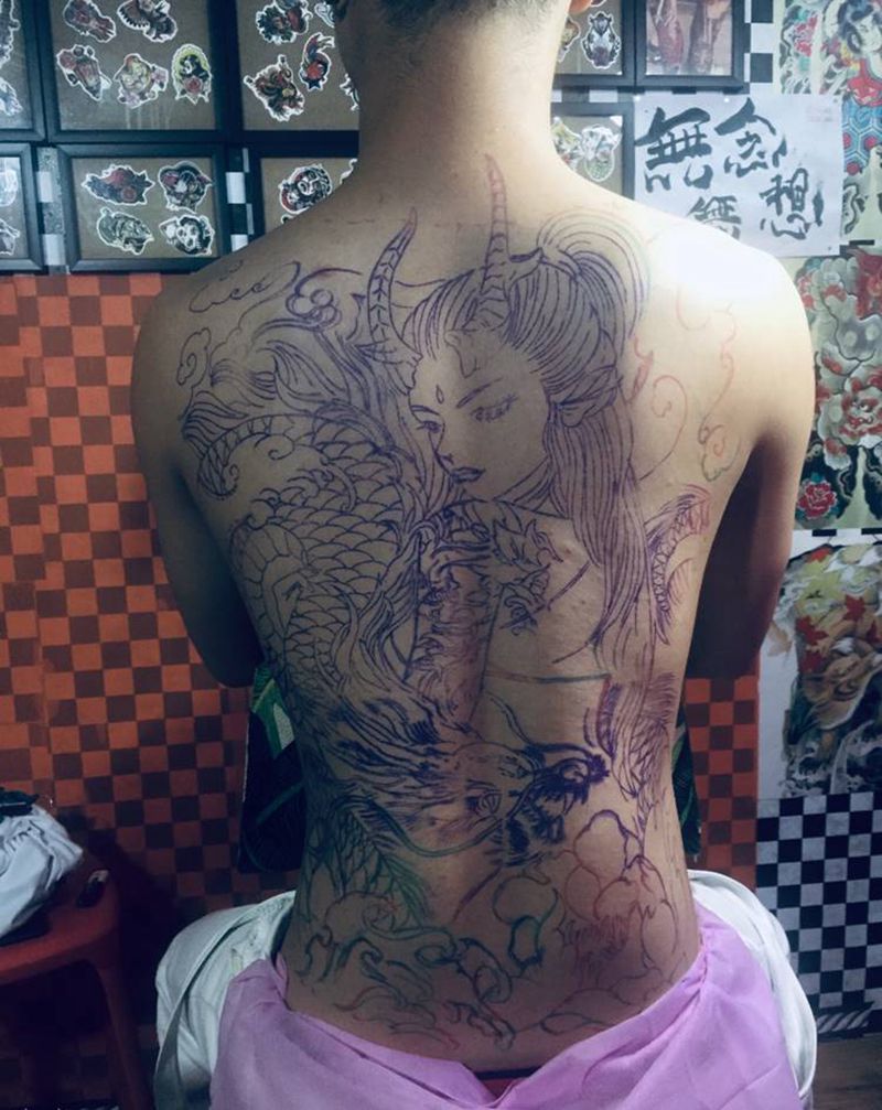 当前位置: 首页 >广东省佛山市纹身店-西樵鲤狮虎刺青纹身图案>满背线条纹身图片_背部纹身图案