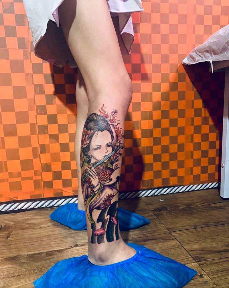当前位置: 首页 >广东省佛山市纹身店-西樵鲤狮虎刺青纹身图案>艺妓纹身图片_腿部纹身图案