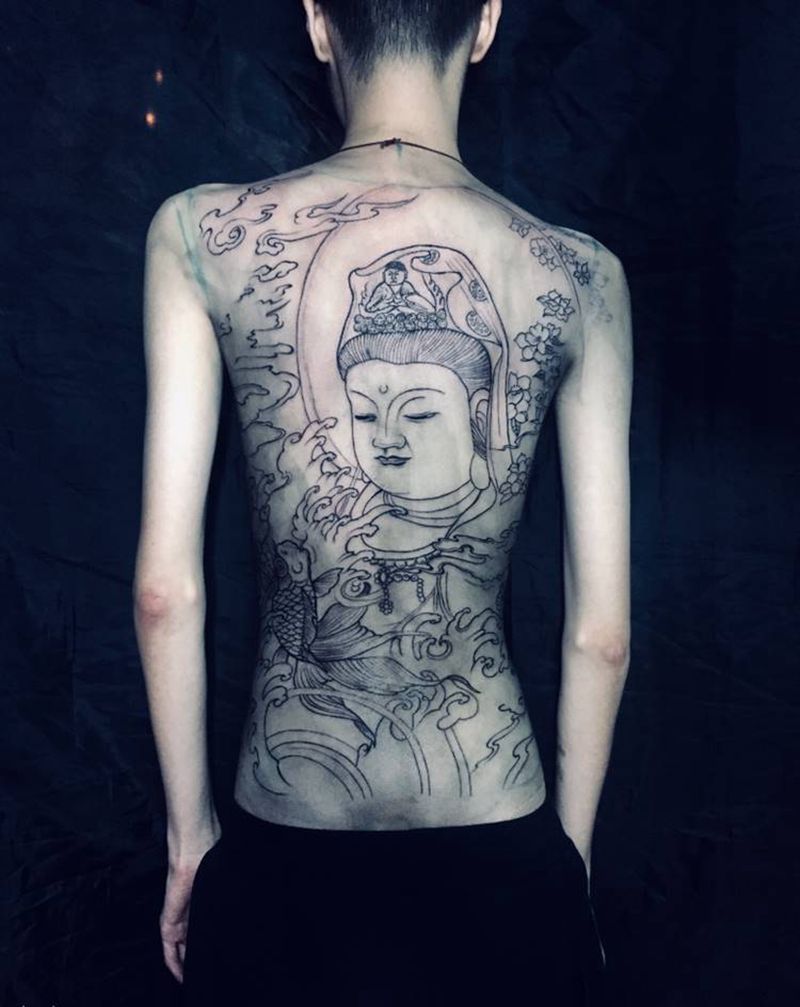 当前位置: 首页 >广东省佛山市纹身店-西樵鲤狮虎刺青纹身图案>观音线条纹身图片_背部纹身图案