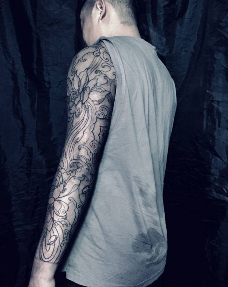 当前位置: 首页 >广东省佛山市纹身店-西樵鲤狮虎刺青纹身图案>莲花花臂线条纹身图片_手臂纹身图案