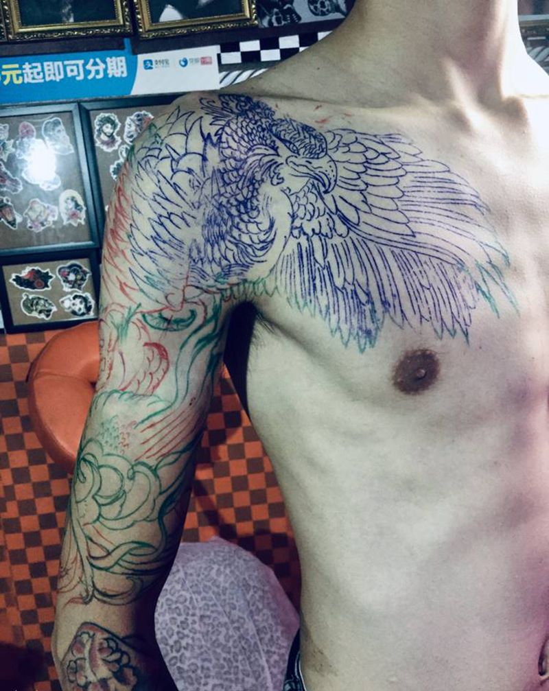 当前位置: 首页 >广东省佛山市纹身店-西樵鲤狮虎刺青纹身图案>半胛部分手绘纹身图片_手臂胸部纹身图案