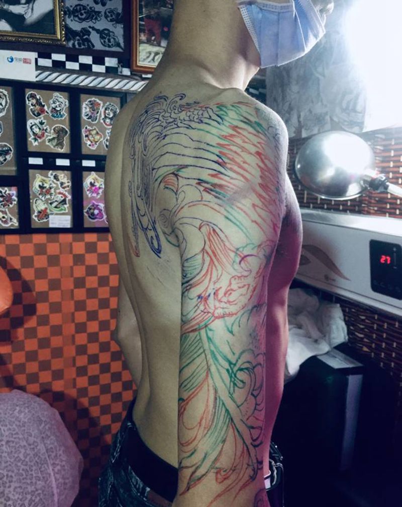 当前位置: 首页 >广东省佛山市纹身店-西樵鲤狮虎刺青纹身图案>半胛部分手绘纹身图片_手臂胸部纹身图案