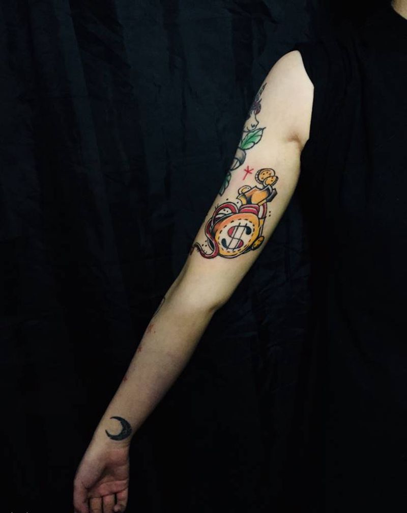 当前位置: 首页 >广东省佛山市纹身店-西樵鲤狮虎刺青纹身图案>金袋纹身图片_手臂纹身图案