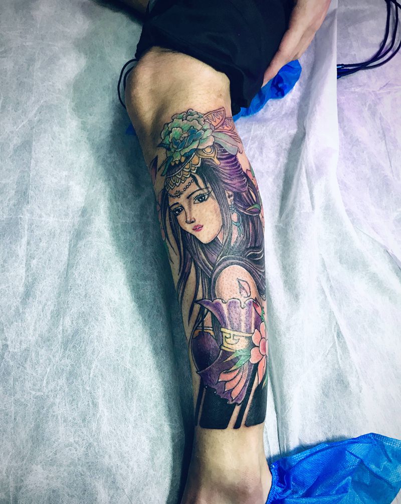 当前位置: 首页 >广东省佛山市纹身店-西樵鲤狮虎刺青纹身图案>艺妓纹身图片_腿部纹身图案
