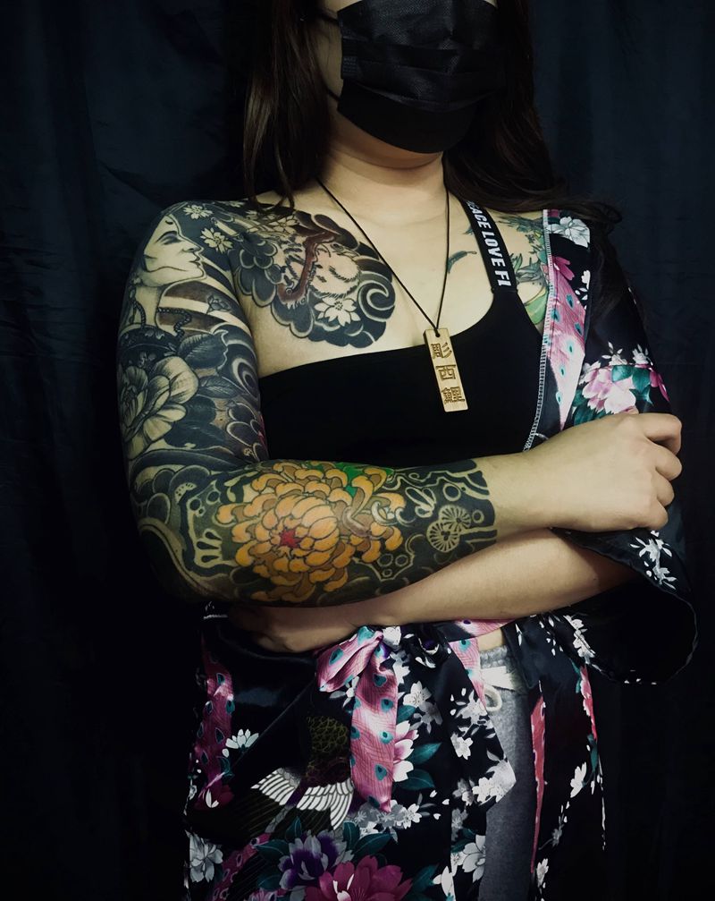 当前位置: 首页 >广东省佛山市纹身店-西樵鲤狮虎刺青纹身图案>美女半胛花臂未完待续纹身图片_手臂胸部纹身图案