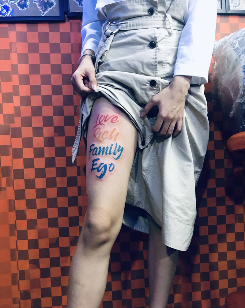 当前位置: 首页 >广东省佛山市纹身店-西樵鲤狮虎刺青纹身图案>美女大腿英文纹身图片_腿部纹身图案