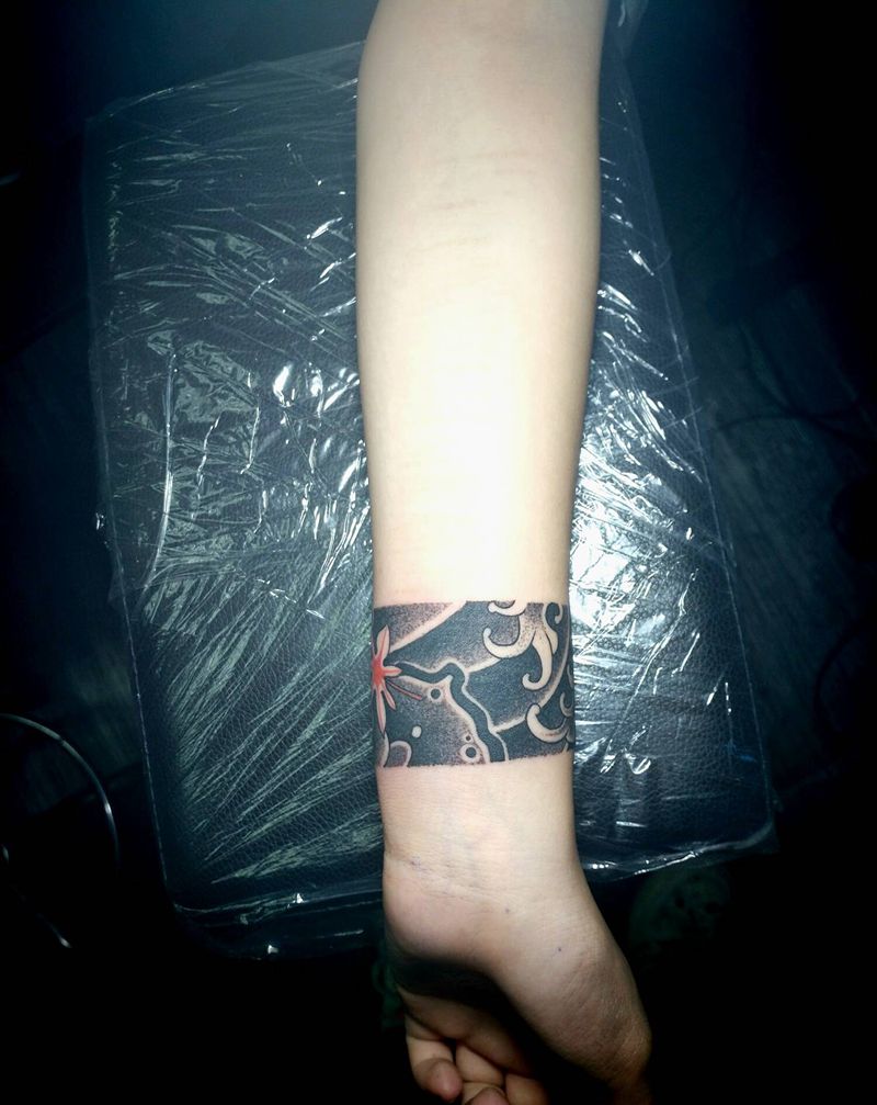 当前位置: 首页 >广东省佛山市纹身店-上将刺青工作室纹身图案>浪花手环纹身图片_手臂老传统点刺纹身图案
