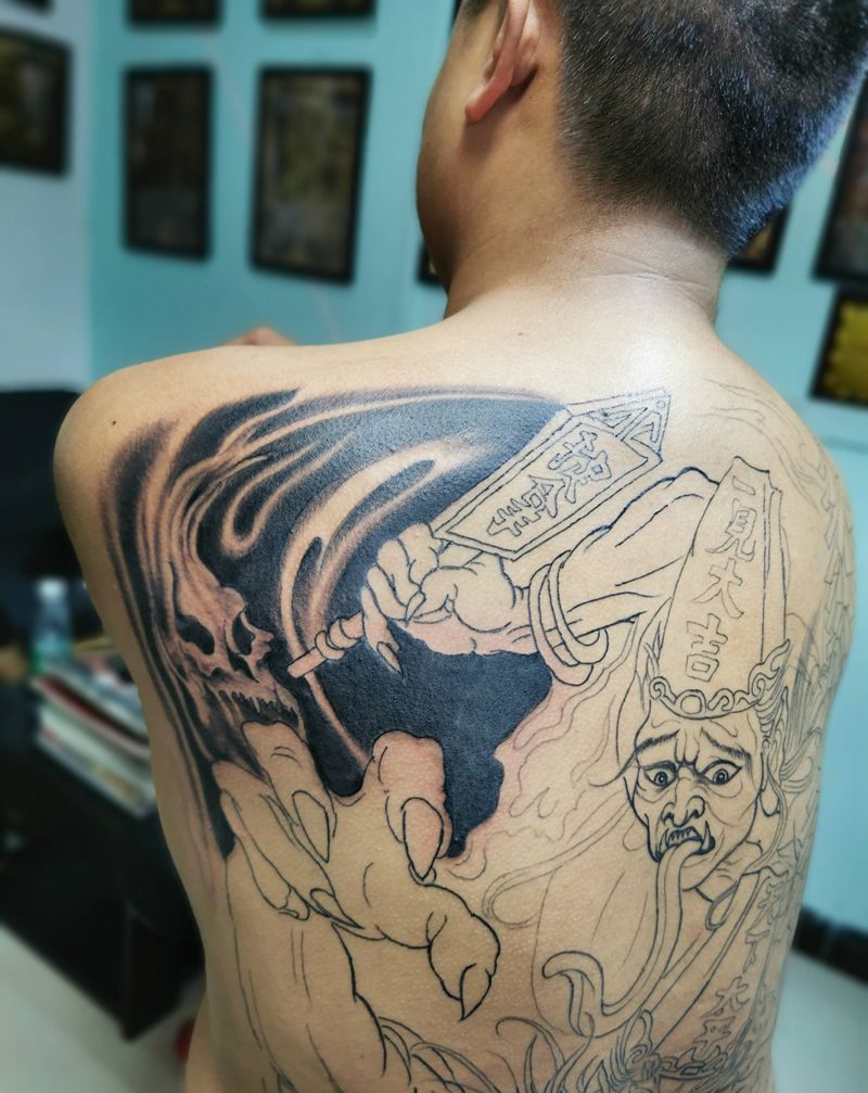 当前位置: 首页 >广东省佛山市纹身店-獨異刺青纹身图案>满背黑白无常纹身图片_背部新传统纹身图案