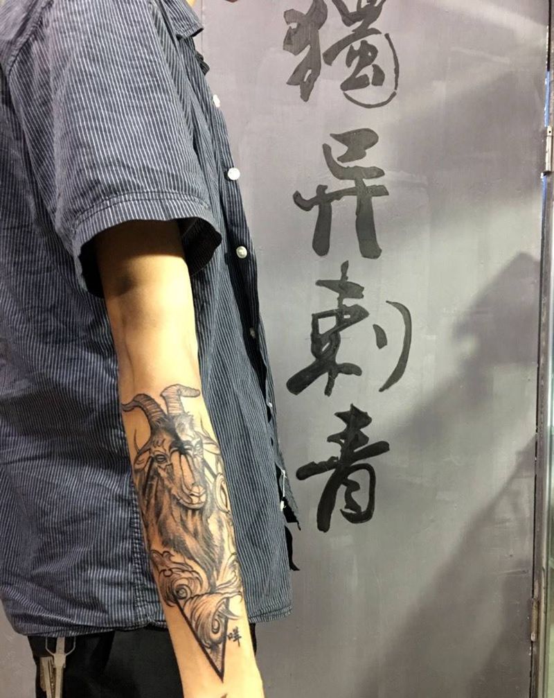 当前位置: 首页 >广东省佛山市纹身店-獨異刺青纹身图案>羊头纹身图片_成品手臂传统动物原创字符纹身图案
