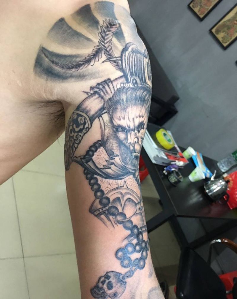 战神花臂纹身图片_成品手臂传统人物纹身图案