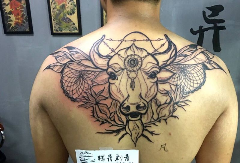 牛头未完成纹身图片_成品背部传统动物几何纹身图案