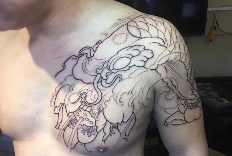 半甲鲤鱼纹身图片_成品肩部胸部传统动物植物纹身图案