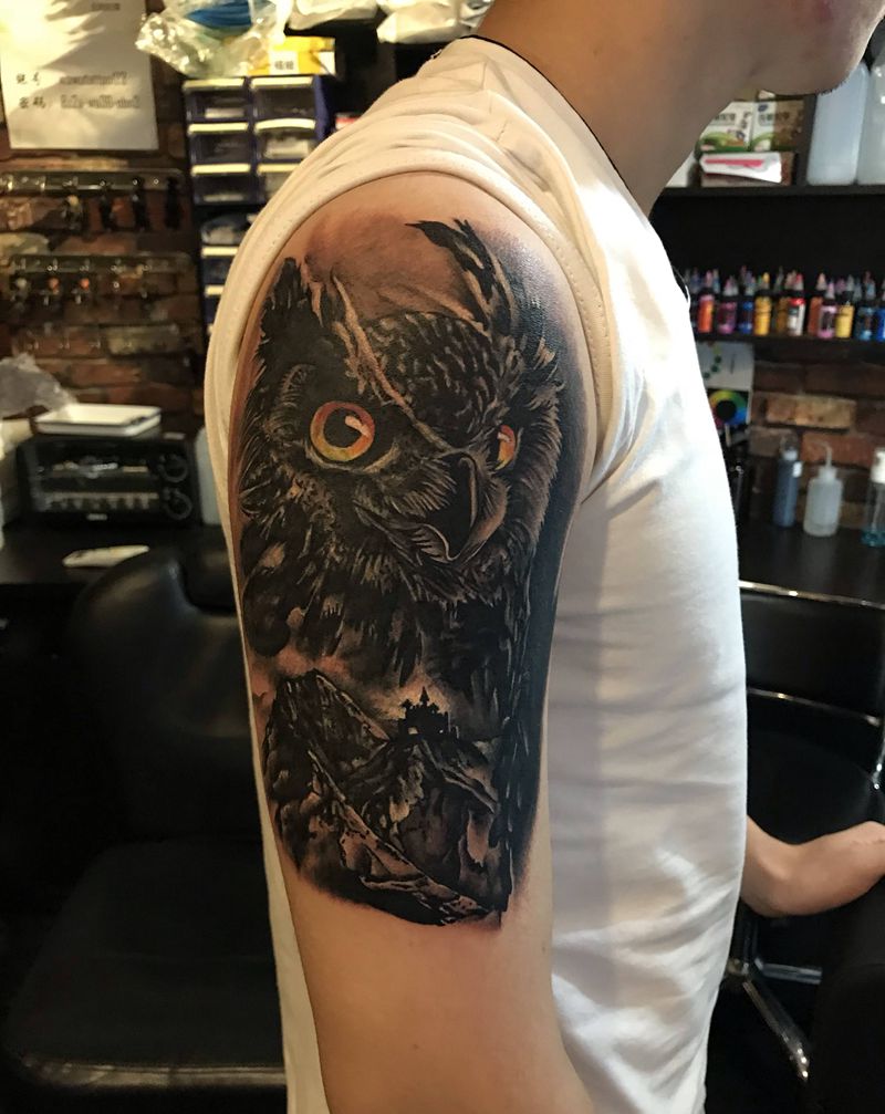 当前位置: 首页 >广东省佛山市纹身店-刺修者纹身店纹身图案>猫头鹰纹身图片_手臂欧美写实纹身图案