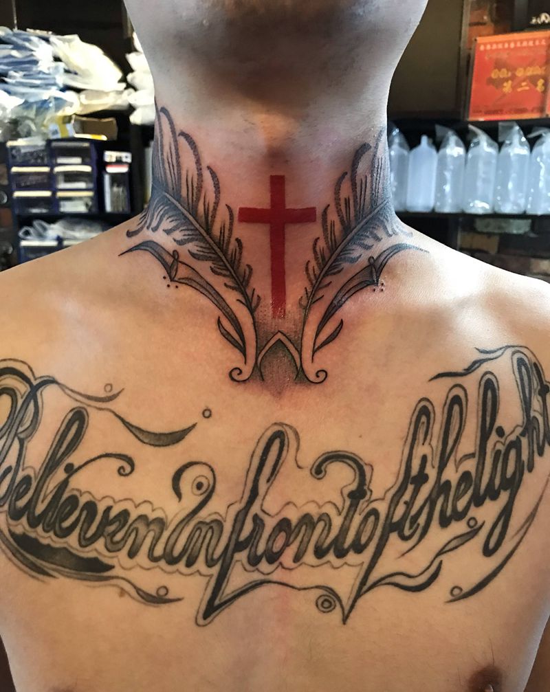 花体纹身图片_颈部胸部花体字纹身图案