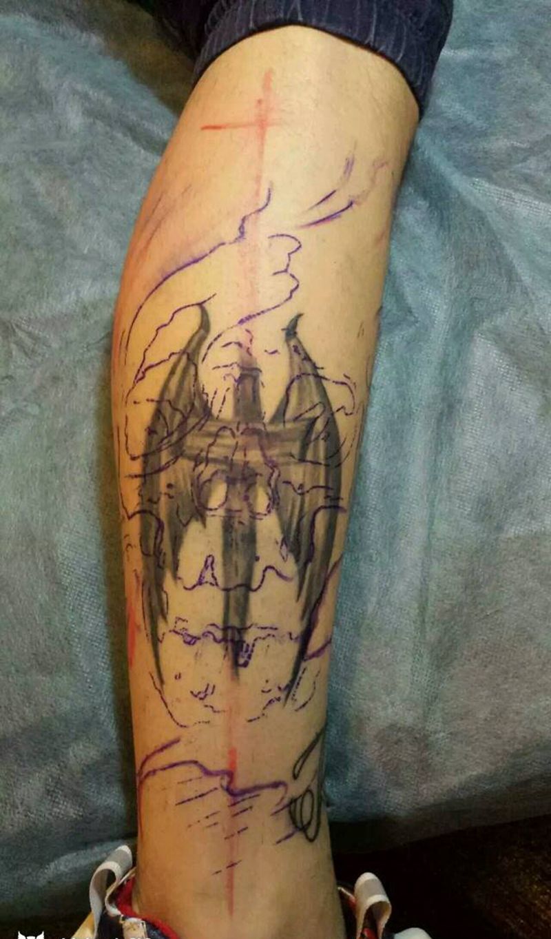 • T包小腿吹火男+阿多福纹身图片_腿部老传统新传统吹火男阿
