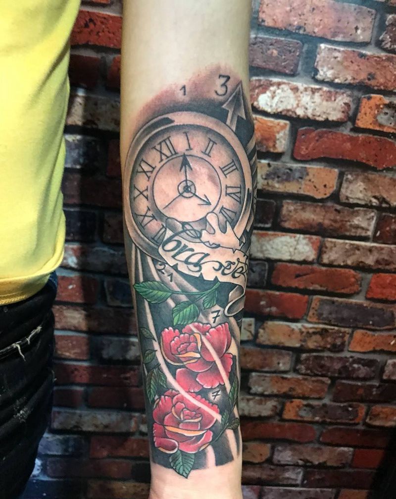 时钟玫瑰纹身图片