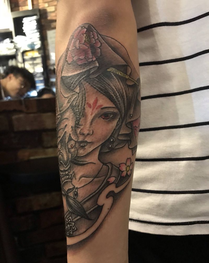 当前位置: 首页 >广东省佛山市纹身店-刺修者纹身店纹身图案>艺妓纹身图片_手臂新传统纹身图案