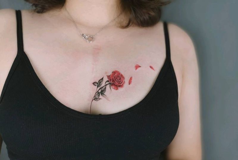玫瑰人生纹身图片_胸部点刺玫瑰花纹身图案
