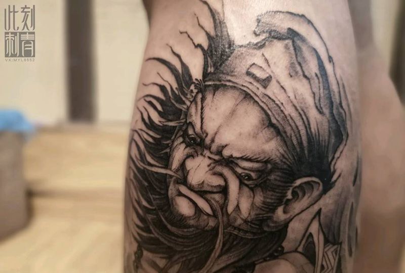 钟馗传说纹身图片_腿部欧美写实水墨钟馗纹身图案