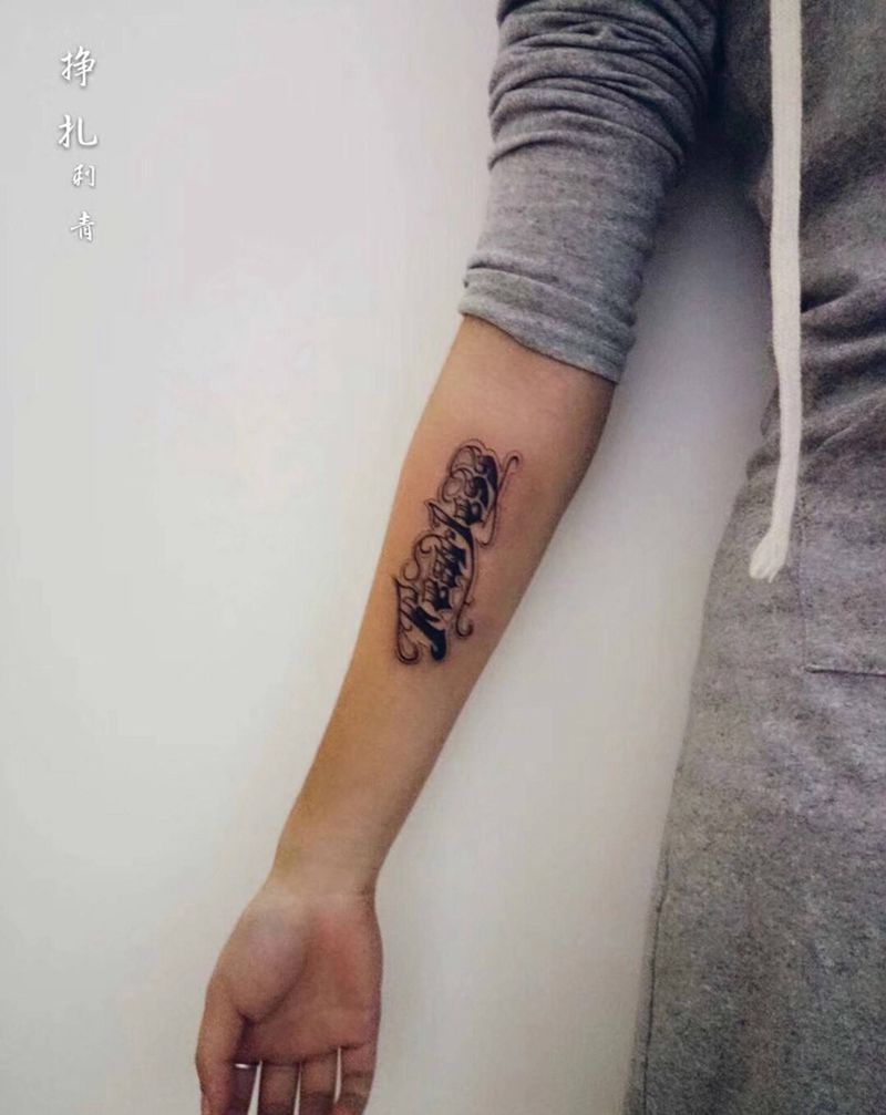 当前位置: 首页 >广东省佛山市纹身店-挣扎刺青工作室纹身图案>信仰纹身图片_手臂手部新传统花体字英文纹身图案