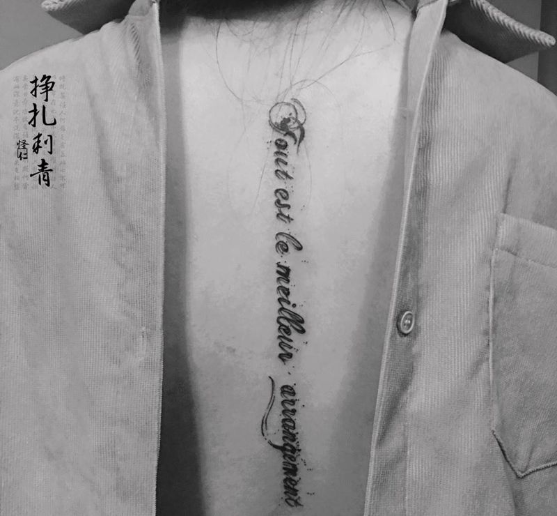当前位置: 首页 >广东省佛山市纹身店-挣扎刺青工作室纹身图案>一切都是最好的安排纹身图片_背部花体字水墨纹身图案