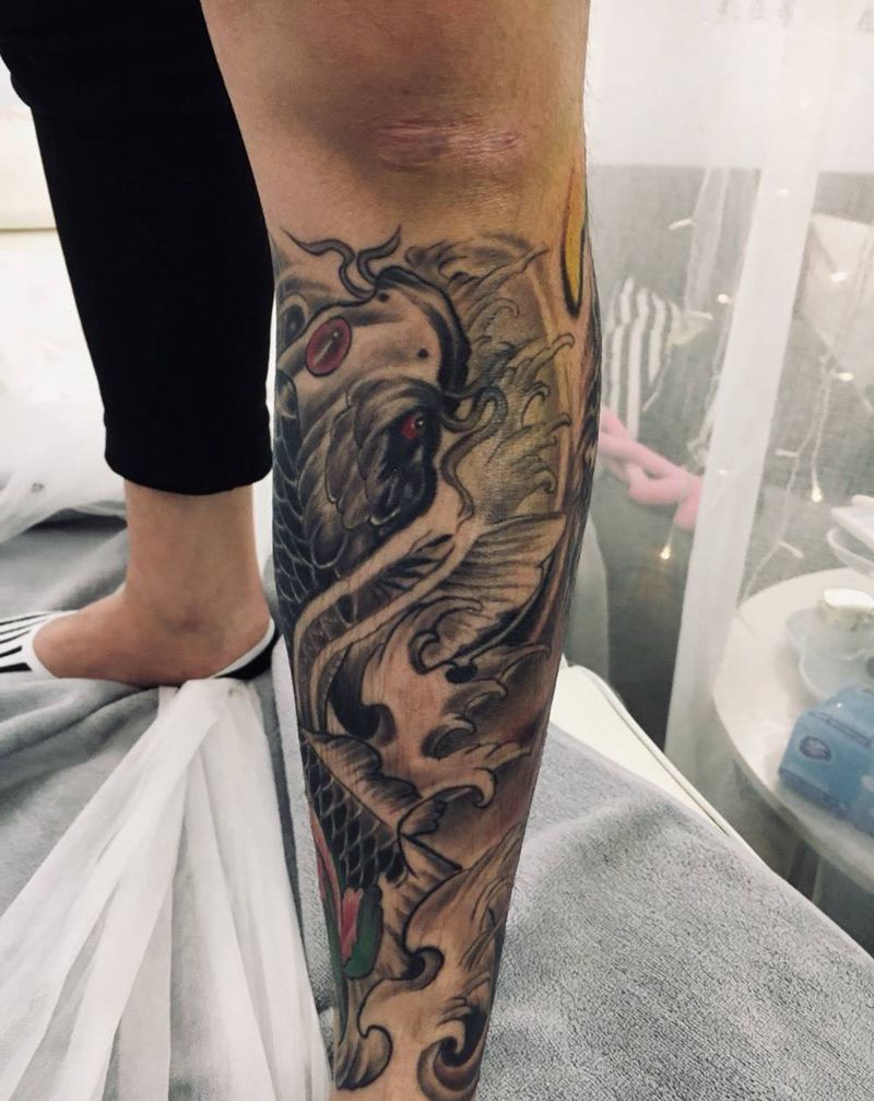 • T网红王老大花腿龙纹身图片_腿部新传统纹身图案