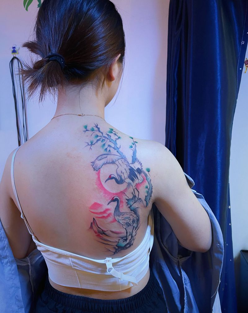 仙鹤 遮盖胎记纹身图片_背部肩部水墨纹身图案