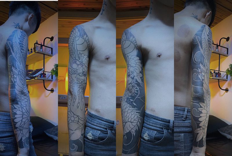 当前位置: 首页 >广东省佛山市纹身店-华势刺青工作室纹身图案>花臂黑灰部分结束纹身图片_手臂手部新传统纹身图案
