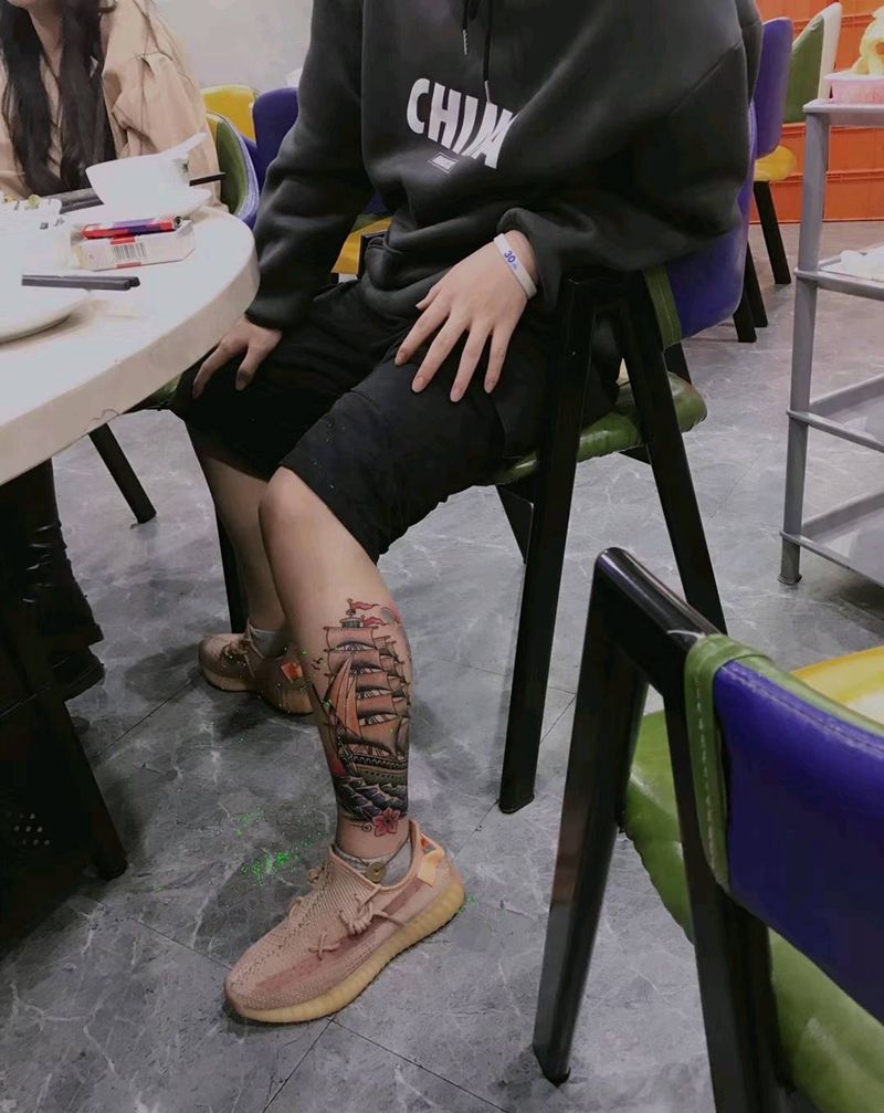 欧美帆船买家秀纹身图片_腿部欧美写实纹身图案