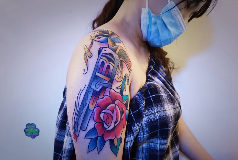 当前位置: 首页 >广东省佛山市纹身店-华势刺青工作室纹身图案>欧美纹身图片_手臂肩部Old School纹身图案