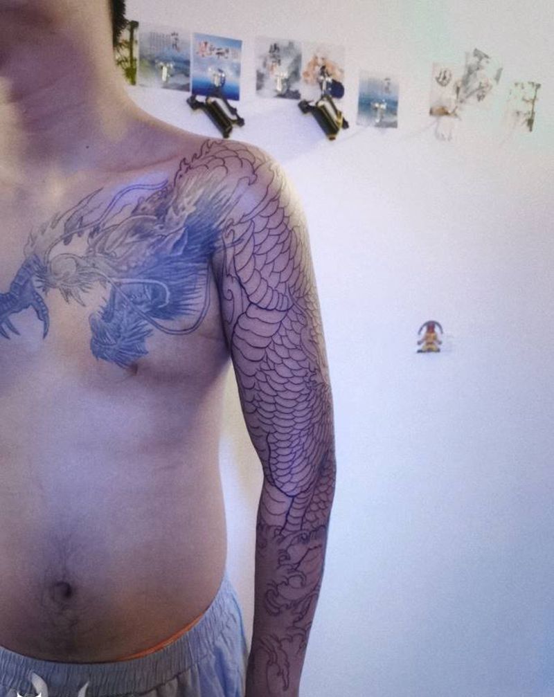 接龙身花臂纹身图片_手部肩部新传统纹身图案