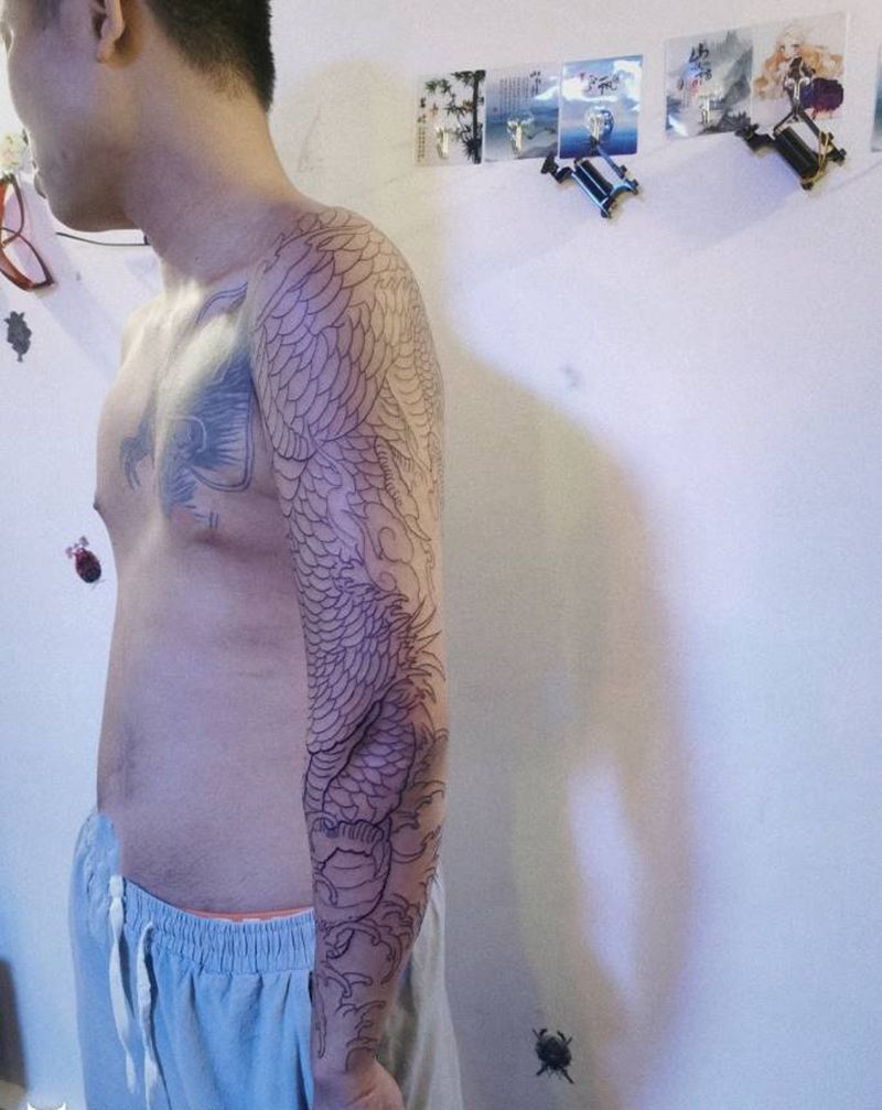 接龙身花臂纹身图片_手部肩部新传统纹身图案