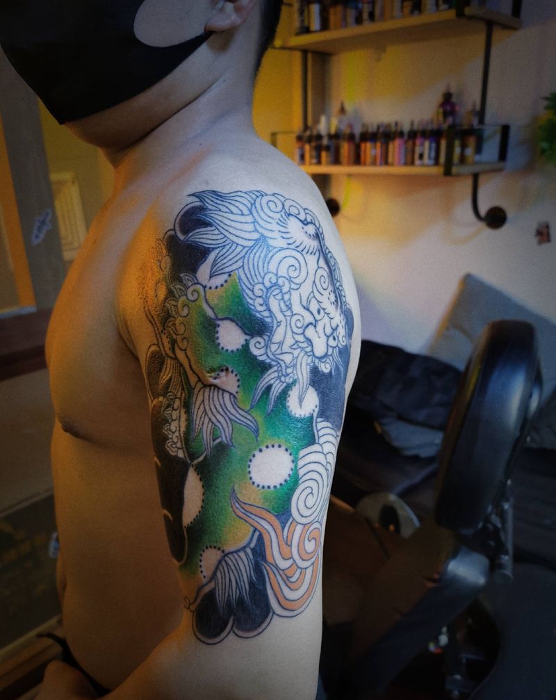 • T网红王老大花腿龙纹身图片_腿部新传统纹身图案