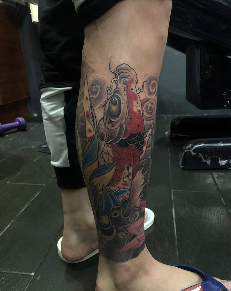 当前位置: 首页 >广东省佛山市纹身店-枭龙刺青纹身图案>鲤鱼仙鹤包小腿纹身图片_腿部脚部老传统纹身图案