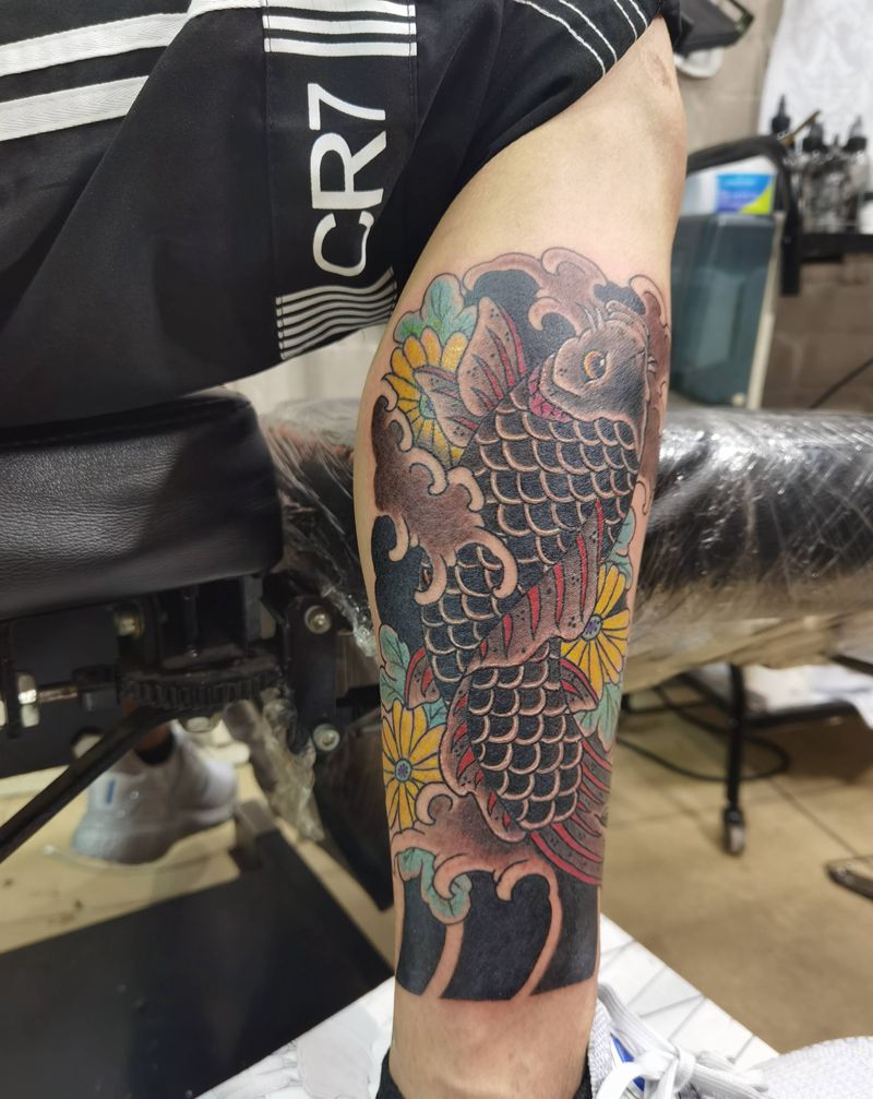 当前位置: 首页 >广东省佛山市纹身店-九龍纹身纹身图案>老传统锦鲤纹身图片_腿部老传统纹身图案