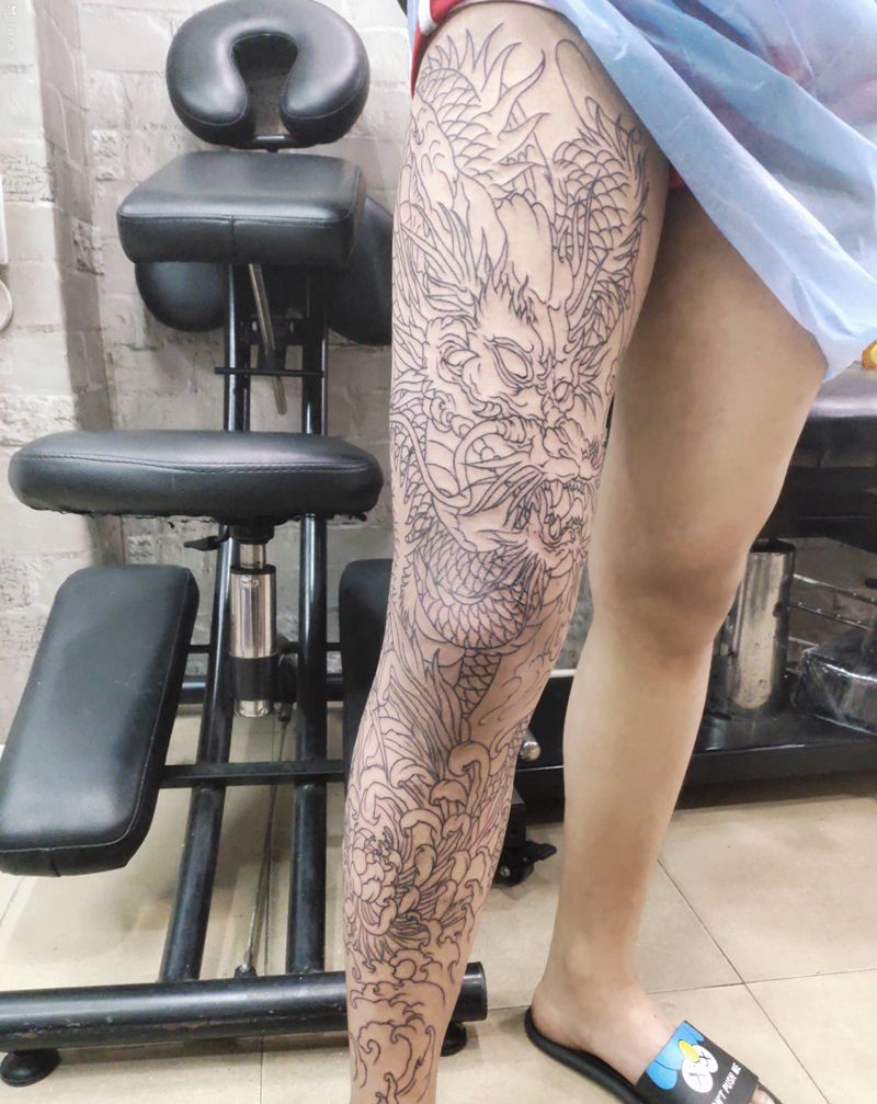 • T网红王老大花腿龙纹身图片_腿部新传统纹身图案