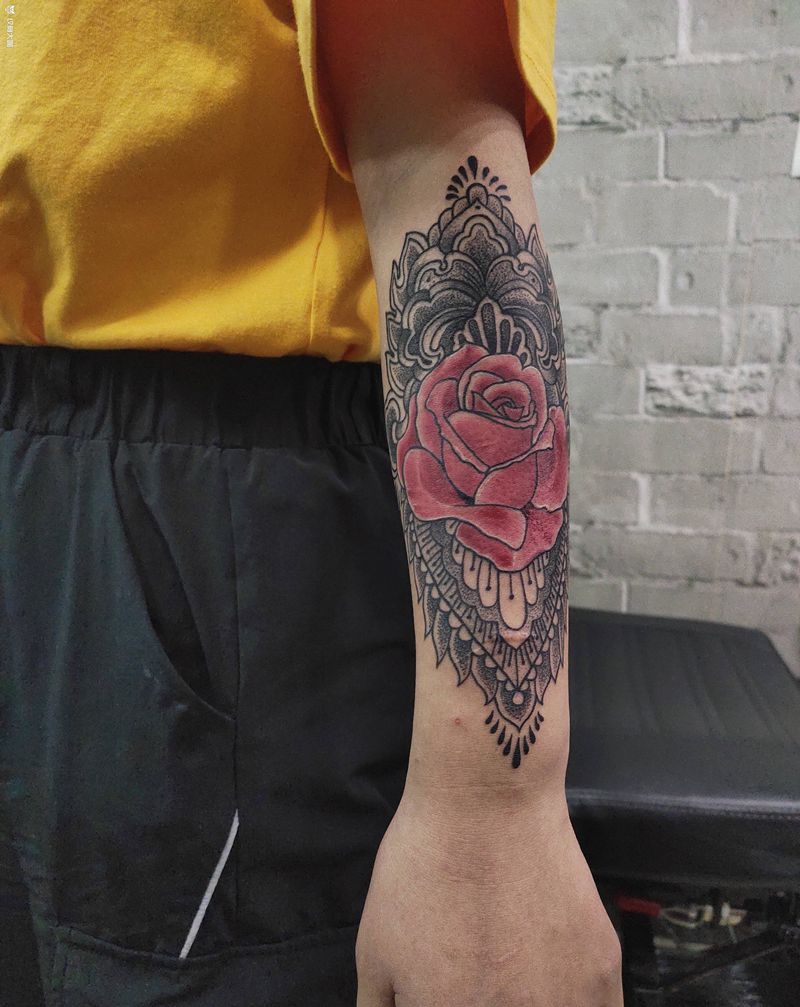 当前位置: 首页 >广东省佛山市纹身店-九龍纹身纹身图案>繁花纹身图片_手臂点刺纹身图案