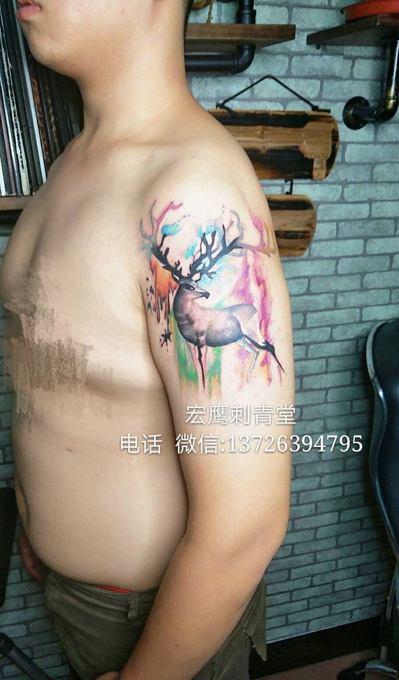 当前位置: 首页 >广东省佛山市纹身店-宏鹰刺青堂纹身图案>水彩鹿纹身图片