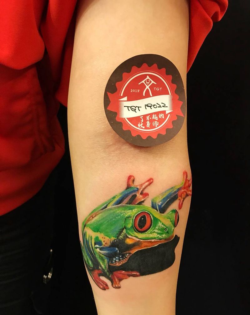 当前位置: 首页 >广东省江门市纹身店-七十七刺青纹身图案>树蛙纹身图片_手部叠彩超写实纹身图案