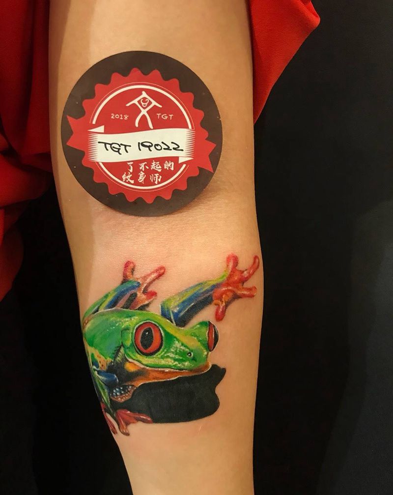 当前位置: 首页 >广东省江门市纹身店-七十七刺青纹身图案>树蛙纹身图片_手部叠彩超写实纹身图案